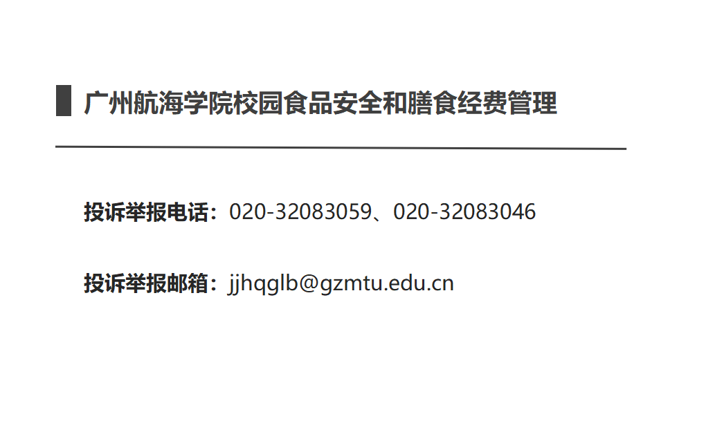 广州航海学院校园食品安全和膳食经费管理 投诉举报电话:020-32083059、020-32083046;投诉举报邮箱:jjhqglb@gzmtu.edu.cn
